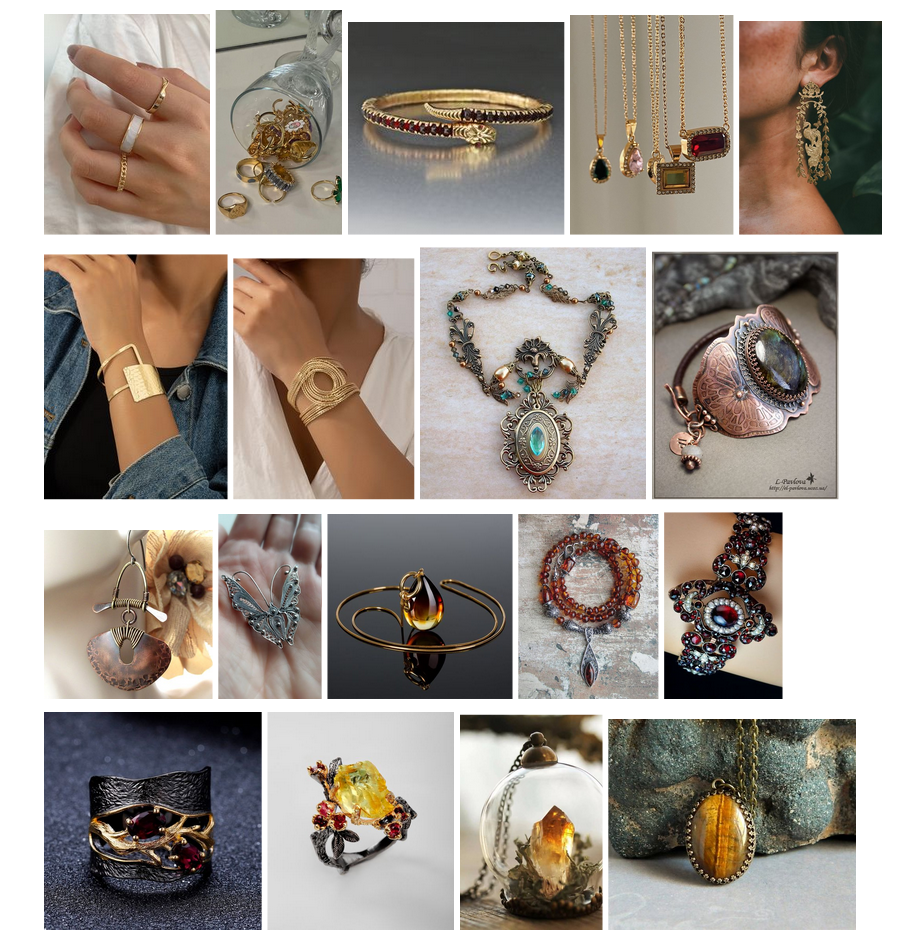 Antique or Vintage Styles: Antique or vintage-style jewelry with warm patinas and intricate details can enhance the palette’s sense of history and richness.