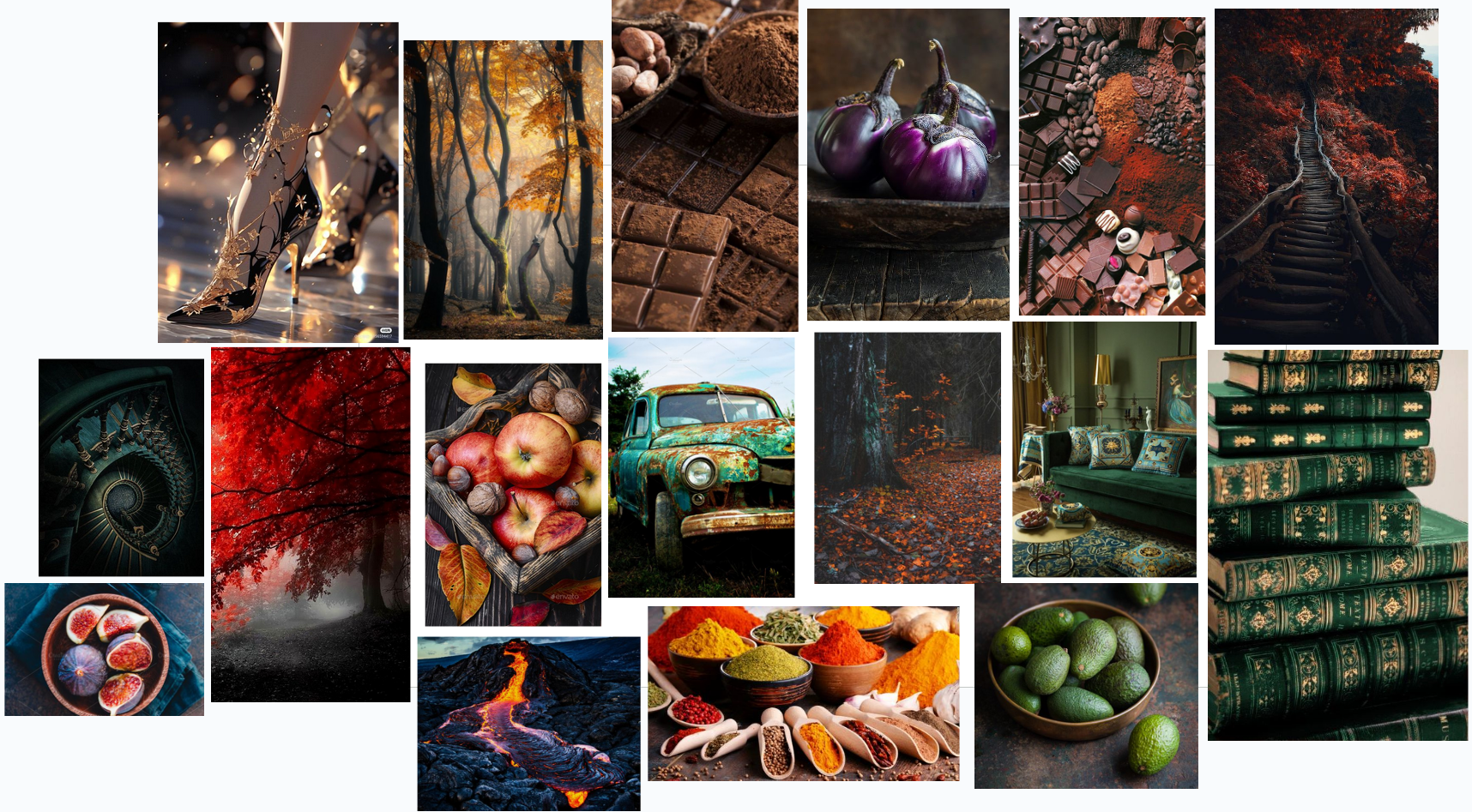 Regal and Luxurious: Dark Autumn colors often exude a sense of regality and luxury, making them well-suited for formal occasions and opulent designs. Autumnal Warmth: The Dark Autumn palette captures the essence of autumn’s warmth and coziness, making it particularly suitable for the fall season. Versatility: Despite its depth, the Dark Autumn palette is versatile. It can be used for both casual and formal settings, allowing for a wide range of creative expressions.